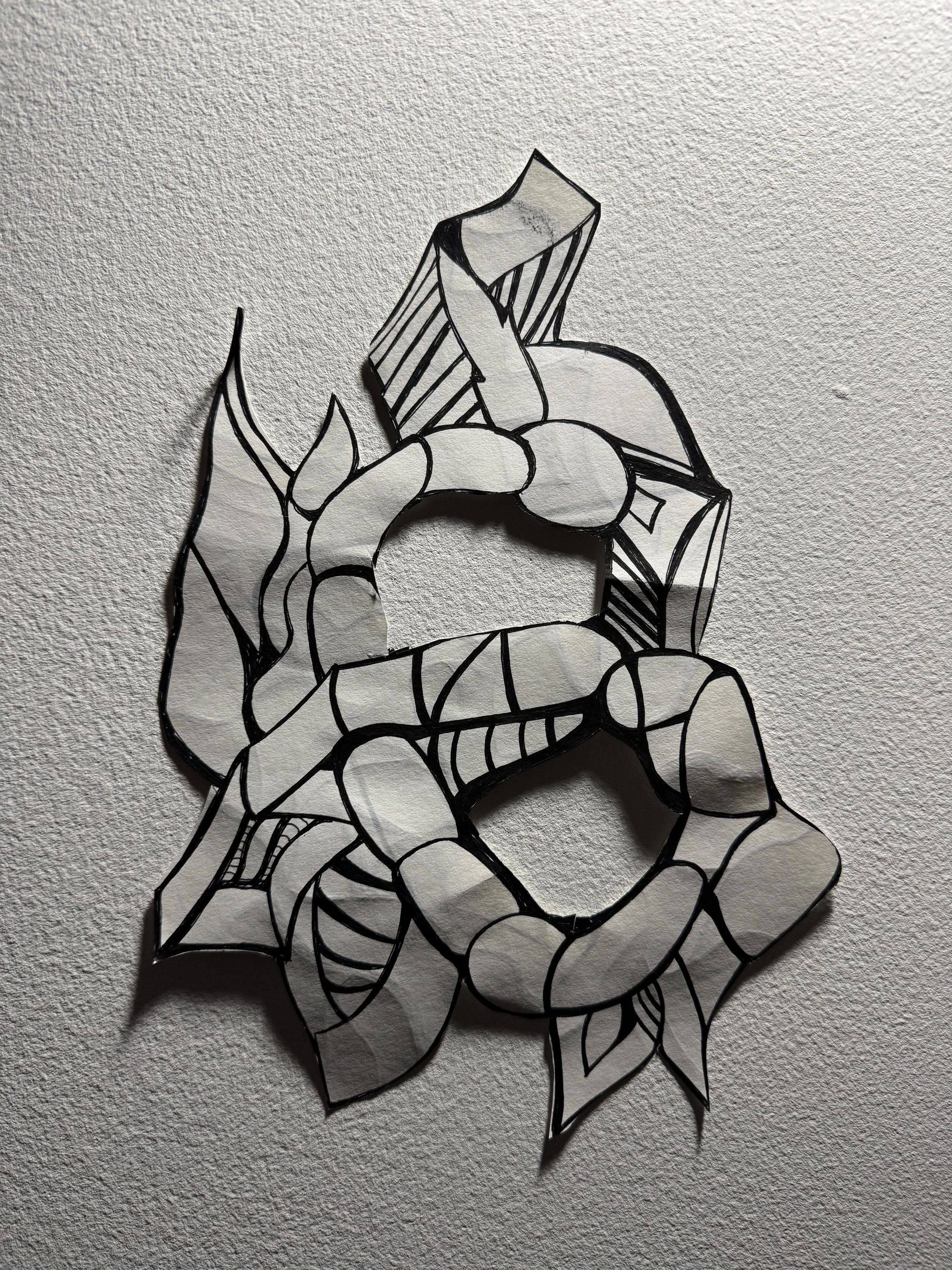 “I draw every day, but my drawings rarely have a concrete endpoint. They remain abstract, blending organic and geometric shapes. This time, I let the prompt guide both my drawing and my process. I decided to cut out my piece—freeing it from the pages of my sketchbook and placing it into the world like any other creature. Now, it exists freely, just as any critter, creature, or creation should.”