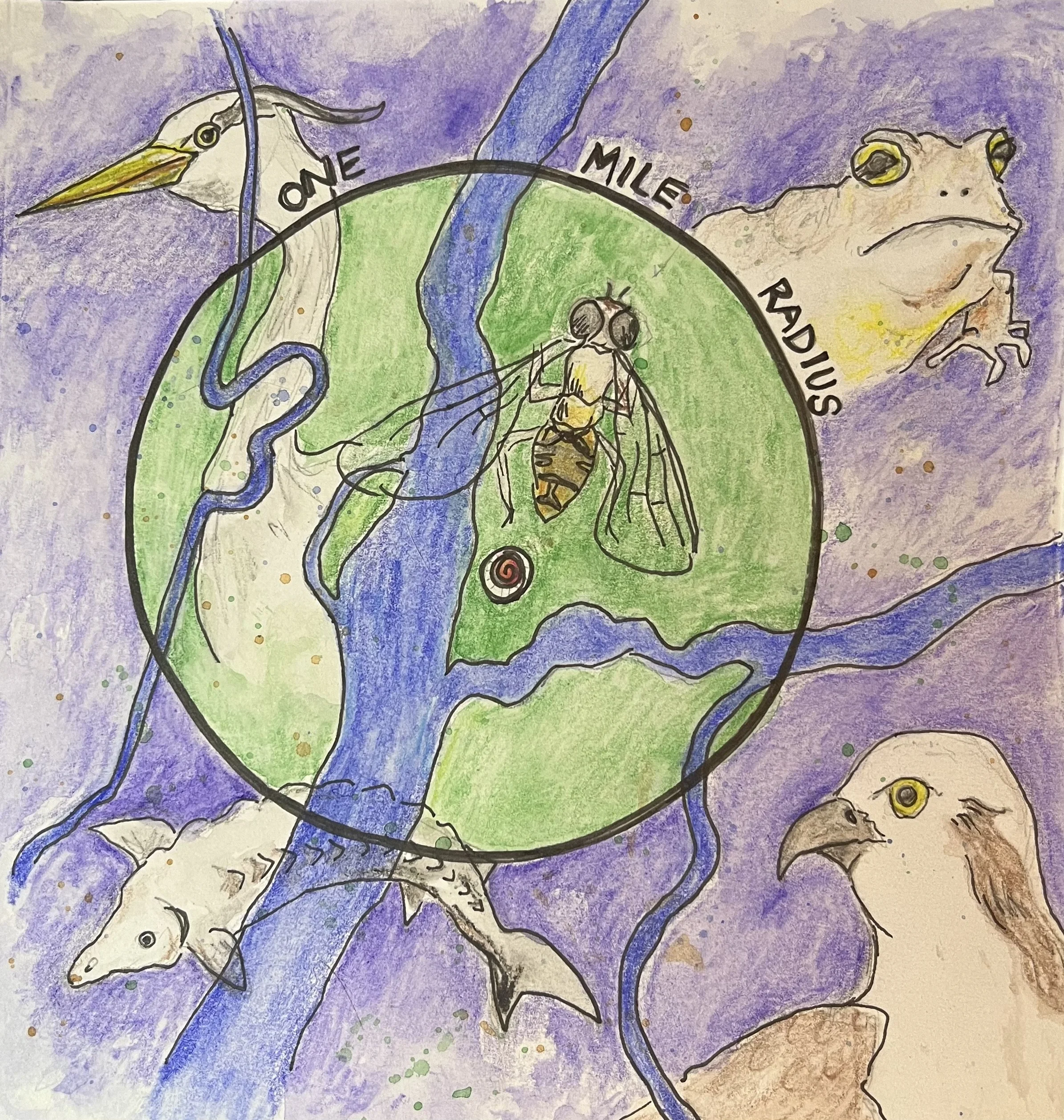 “I loved this prompt and admittedly approached it quite literally. I studied maps of where I live, nestled between the Kennebec and Sebasticook rivers, and considered the wildlife that thrives in these waters and wetlands. This habitat is home to countless creatures, including the American toad depicted here, who I often encounter in my driveway eating ants. As I reflected on place, I also thought about why humans, too, are drawn to rivers. My house is marked by the spiral red dot on the map, a small point in this vast and vibrant ecosystem. I feel incredibly lucky to be surrounded by these waterways and grateful to live at the top of a hill, just beyond the floodplain’s reach.”