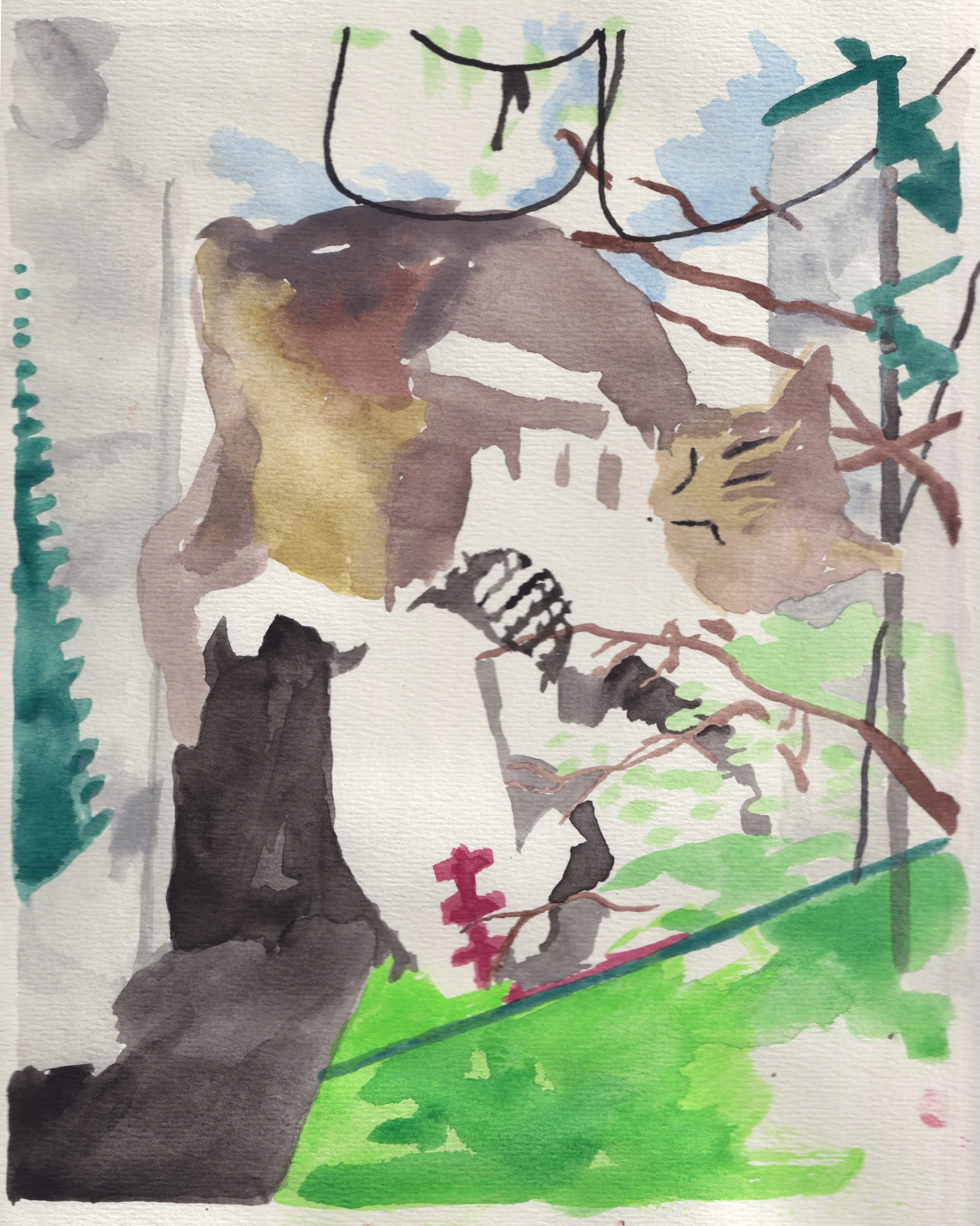 “For this prompt I layered images from my everyday - dressing up, playing with my cat, and going on a hike - and used gouache to decide what bleeds through and what is lost.”