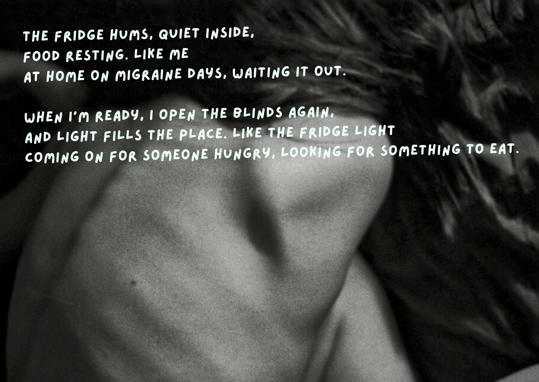 “As a photographer, I first thought about the fridge visually, the mix of colors, the mess and the order inside. But then I realized its nature as a storage space, how it slows time so food will be "okay" in its calming darkness. Long story short, it's like what I try to create around me when surviving a migraine.”