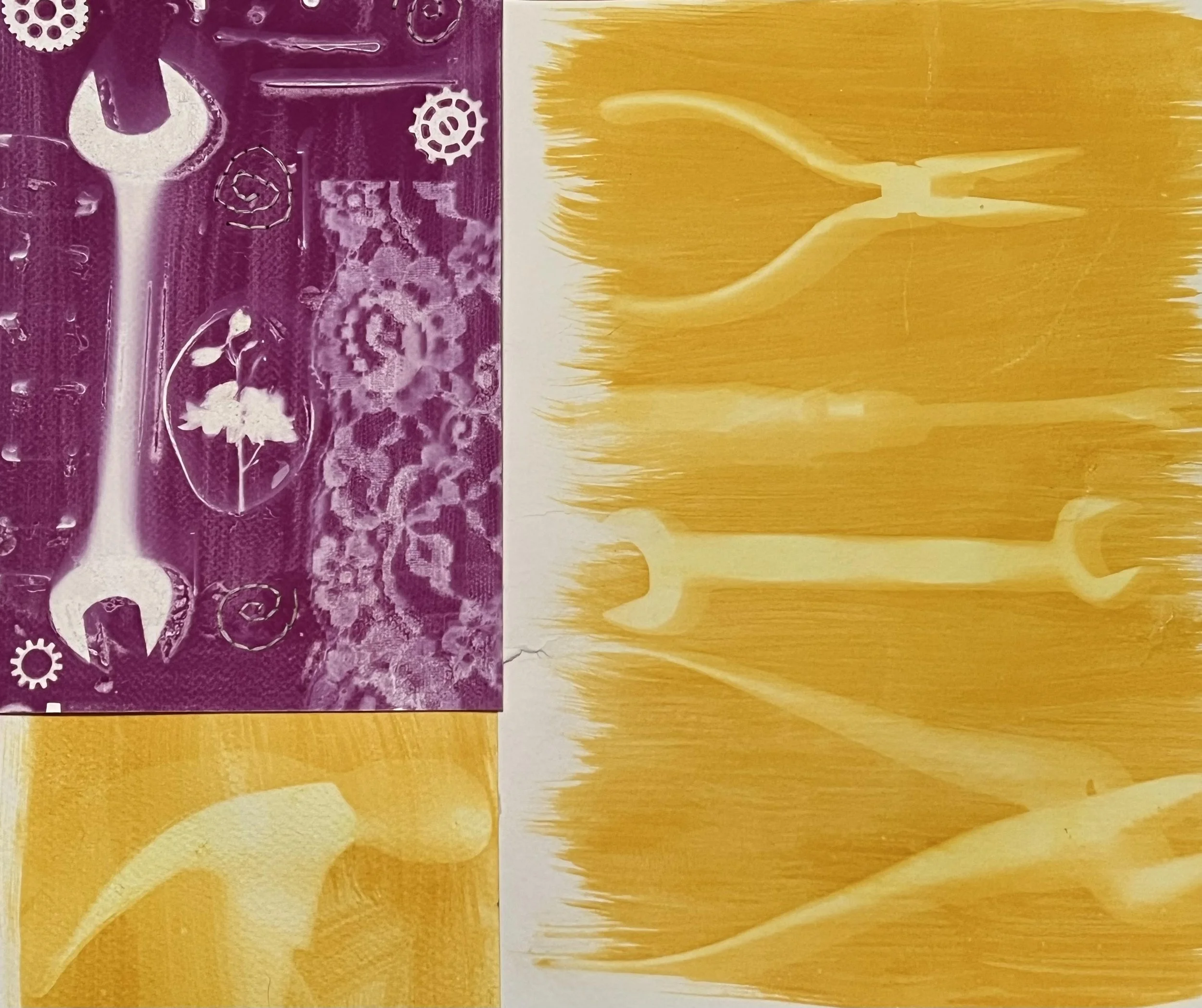Solar printing and embroidery on watercolor paper with found objects